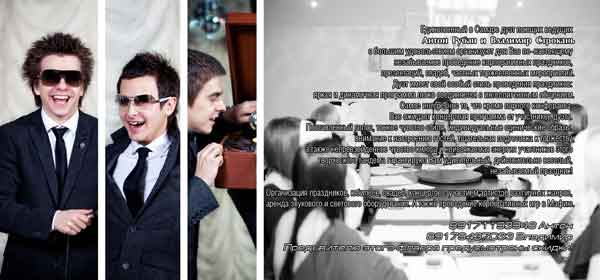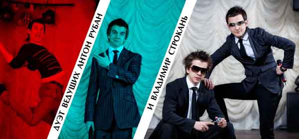 Дуэт поющих ведущих Антон Рубан и Владимир Строкань с большим удовольствием организуют для Вас по-настоящему незабываемое проведение корпоративных праздников, презентаций, свадеб, частных торжественных мероприятий. Дуэт имеет свой особый стиль проведения праздников: яркая и динамичная программа легко соединяется с интеллигентным общением.