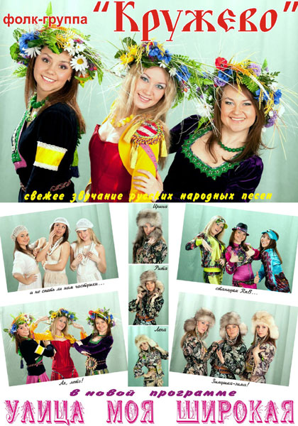 П р е д с т а в л я е т: Лауреатов Всероссийских и Международных конкурсов ФОЛК - ГРУППА «КРУЖЕВО» Фолк – шоу группа «Кружево» впервые ярко заявила о себе 12 июня 2010 года, участвуя в концертах посвященных празднованию Дня Города. Этот день теперь и считается днем рождения коллектива. Конечно, идея создания зародилась намного раньше, была проведена большая подготовка прежде чем « Кружево» предстали перед зрителями в полной красе! В составе коллектива три молодые талантливые девушки: Маргарита Молоковских, Елена Чернова и Ирина Баранова. Девушки всерьез увлечены своей любимой профессией изучают историю русской песни, любят исполнять фольклорные песни. Они молоды и активны, поэтому визитной карточкой коллектива является некий «микс», смешение стилей, направлений, как в музыкальном материале, так и в постановках концертных номеров и в костюмах. Все костюмы коллектива эксклюзивны и сшиты по разработанным эскизам на заказ, конечно, их отличает обилие кружева, ручной вышивки и использование натуральных материалов, при этом они эклектичны и оригинальны. Не зря «Кружево» фолк – шоу группа, элементы шоу присутствуют и в костюмах, используется стекловолокно и светодиоды и неожиданно для зрителя венки из полевых цветов во время исполнения песни «Иван Купала» зажигаются ярким светом, создавая неповторимый эффект. Всем известно, что молодежь увлечена клубной музыкой, ведь технические возможности в наши дни безграничны, «Кружево» стараются путем соединения «модной» аранжировки и душевной русской народной песни заинтересовать молодых людей истоками, той напевностью, проникновенностью, традициями русской песни, русского народа и у них обязательно получится! У фолк–шоу группы «Кружево» богатый репертуар, любимые и знакомые всем народные песни, песни исполняемые А капелла, они могут подобрать ключик к сердцу любого возраста и стать достойным ярким украшением любого праздника! | АФИША / АНОНС! ЗИМНЯЯ АКЦИЯ Баннер за 1000 руб/мес. Новые размещения ART-BAZA РЕКОМЕНДУЕТ ![]() Бармен-шоу Сергея Грибкова ![]() Цыганский ансамбль «Очи Чёрные» ![]() Саксофонист Яков Зиновьев - (Прямые контакты) ![]() Певица Саина ![]() Ведущий, шоу-мен Антон Антонов ![]() Bar-Show-Woman, модель, Prima GO-GO Dance Надежда Рослова ![]() Театр Национального Балета Грузии «МЕТЕХИ» ('METEKHI) ![]() Группа «ШАNА» (Украина, г. Харьков) |